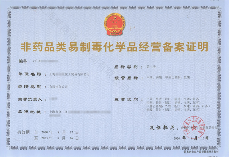 上海市危险化学品安全管理办法(沪府令44号)、危险化学品经营许可证管理办法(第55号)、危险化学品安全管理条例(第591号令)、 易制毒化学品管理条例(第445号)、 非药品类易制毒化学品生产经营许可办法(第5号)、生产安全事故应急预案管理办法(第17号)、易制爆危险化学品治安管理办法(第154号)