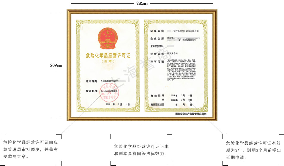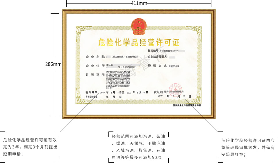 危险化学品经营许可证(应急管理局)和成品油零售经营批准证书(商务局)。